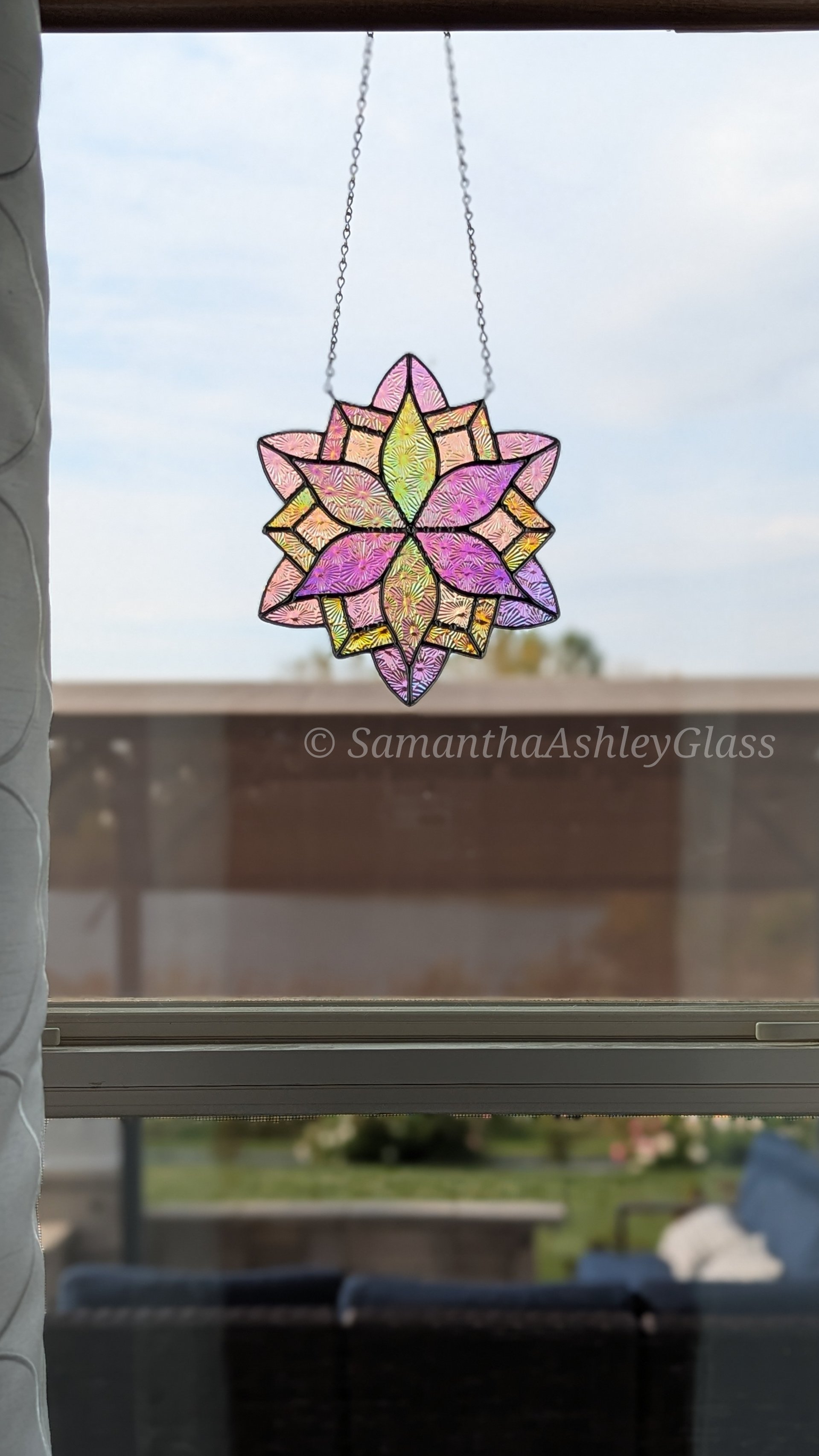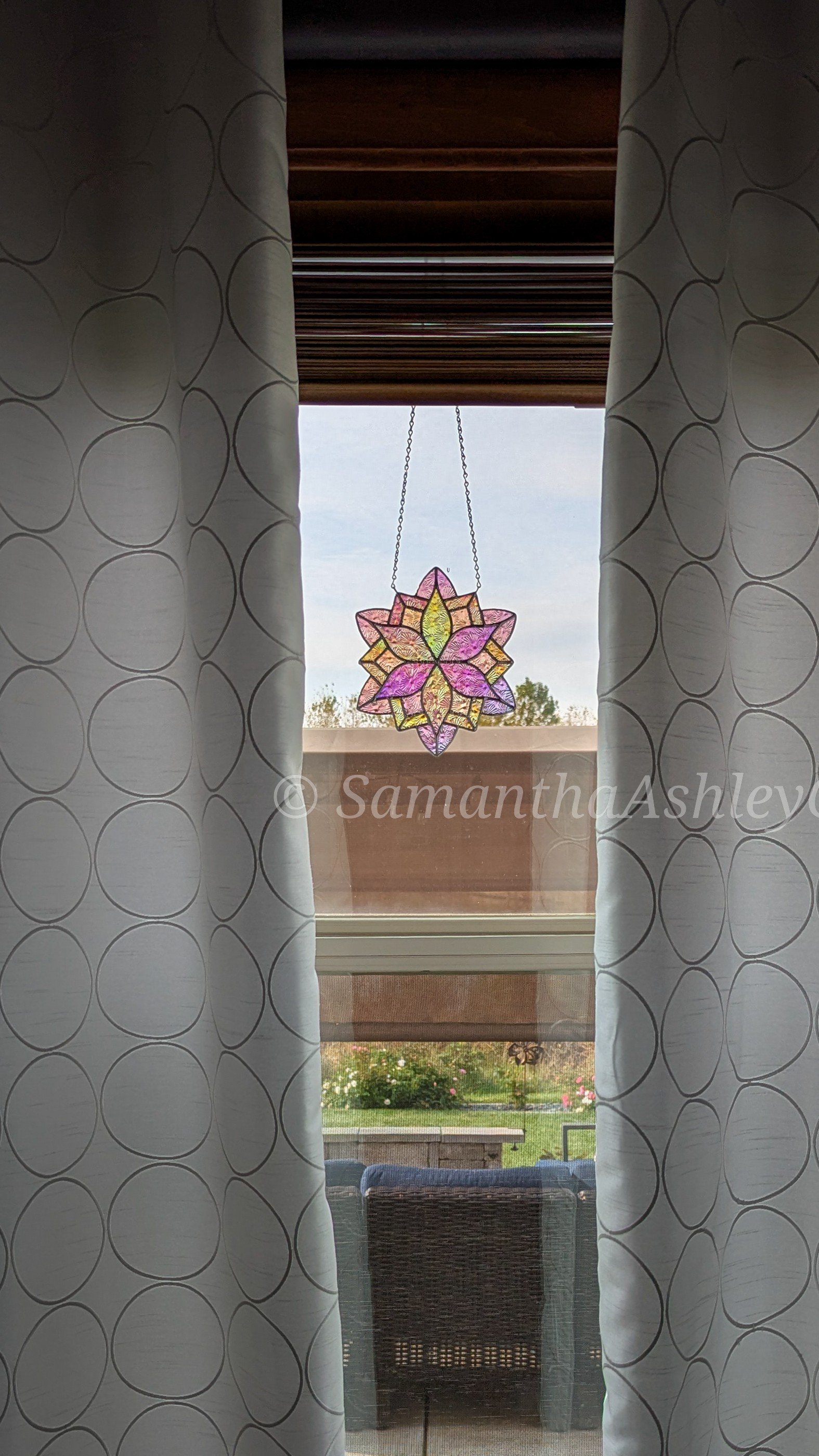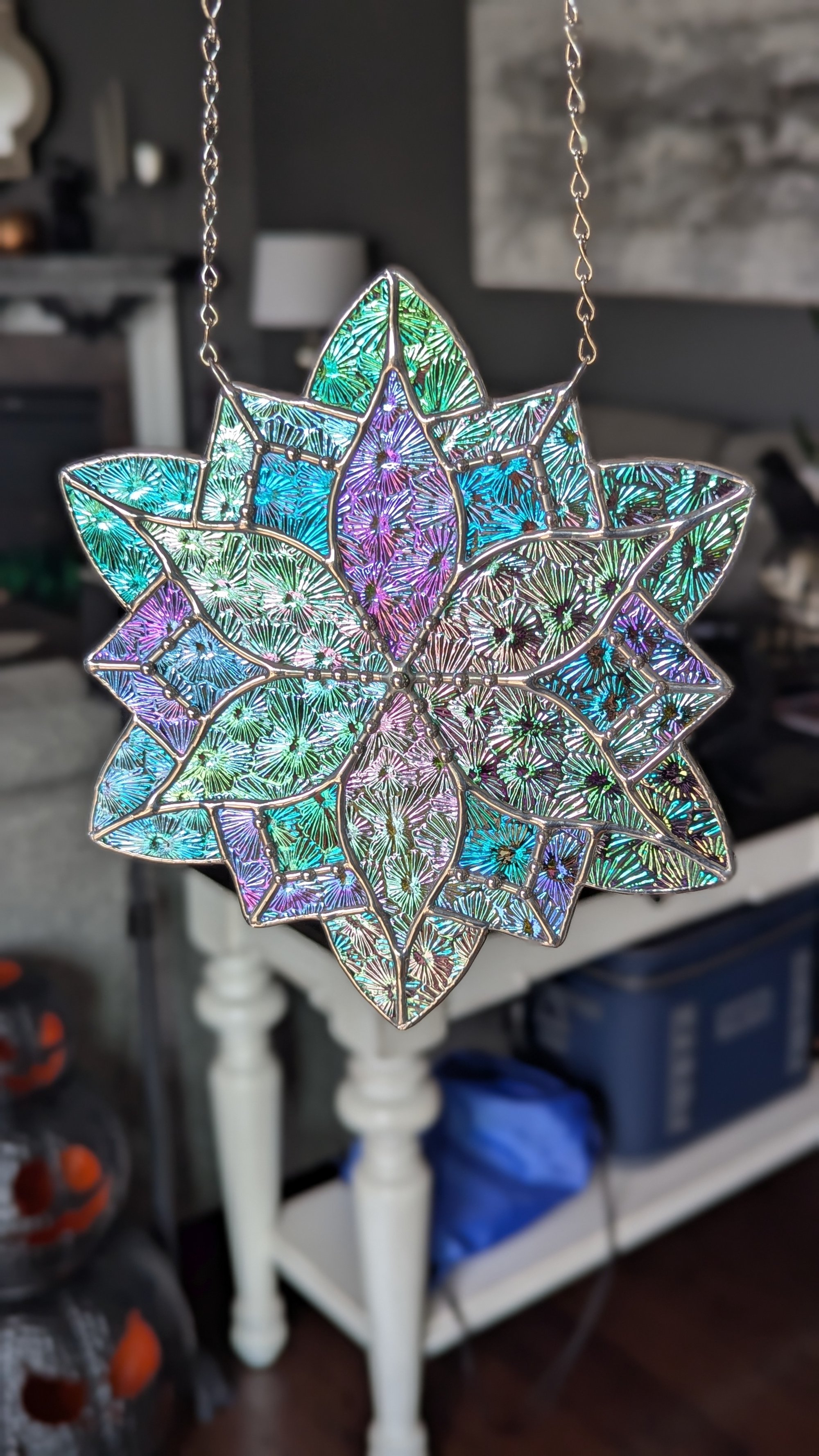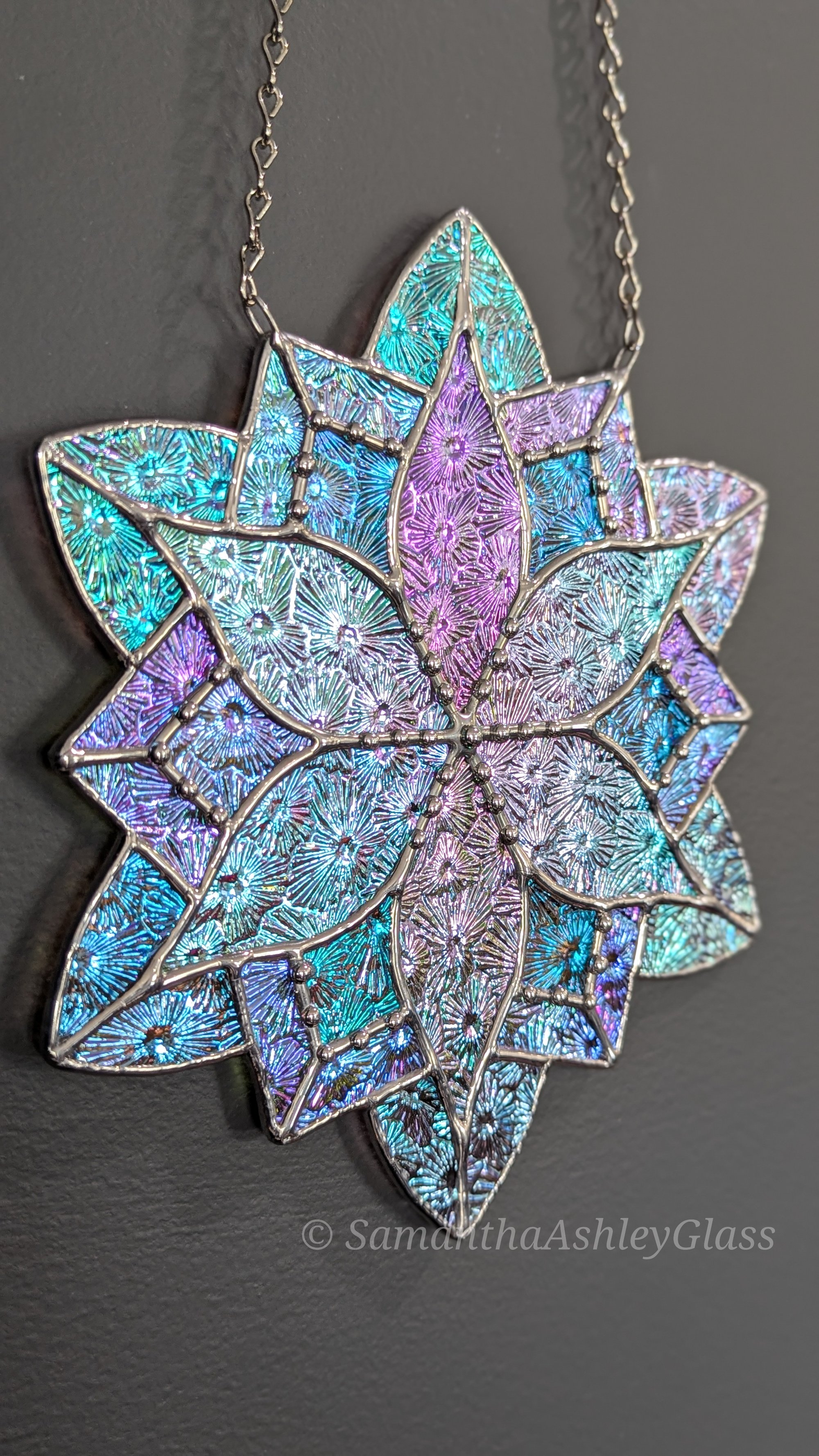 **This item contains lead. The wax finishing seals the lead and creates a protective barrier to slow down corrosion/oxidation. You should periodically rewax/buff stained glass suncatchers. Lead can be harmful only if ingested - keep out of reach of children (who tend to put things in their mouths), and wash hands after handling.**